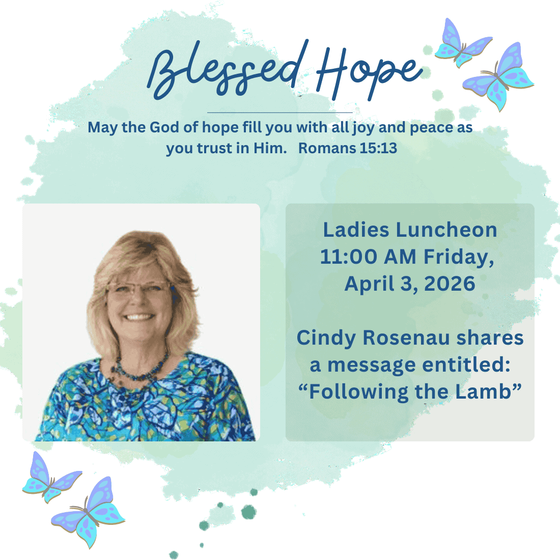 The Blessed Hope Committee invites you join us for a beautiful time of food and fellowship with our ladies in addition to an encouraging message!